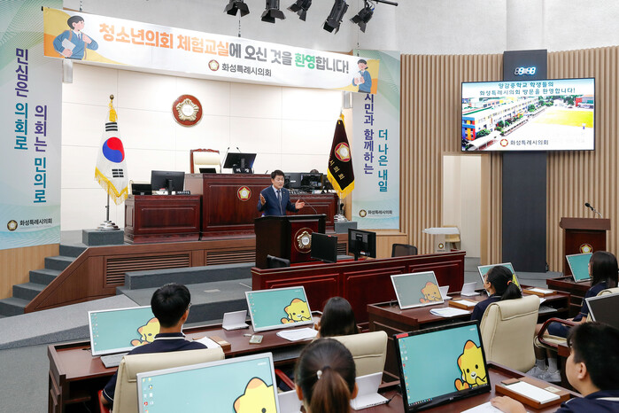 [화성=송윤근 기자] 경기 화성특례시의회(의장 배정수)는 3일, 양감중학교(양감면) 학생들과 함께 의회 시설 견학 및 본회의장 모의의회 체험 등을 실시했다.
