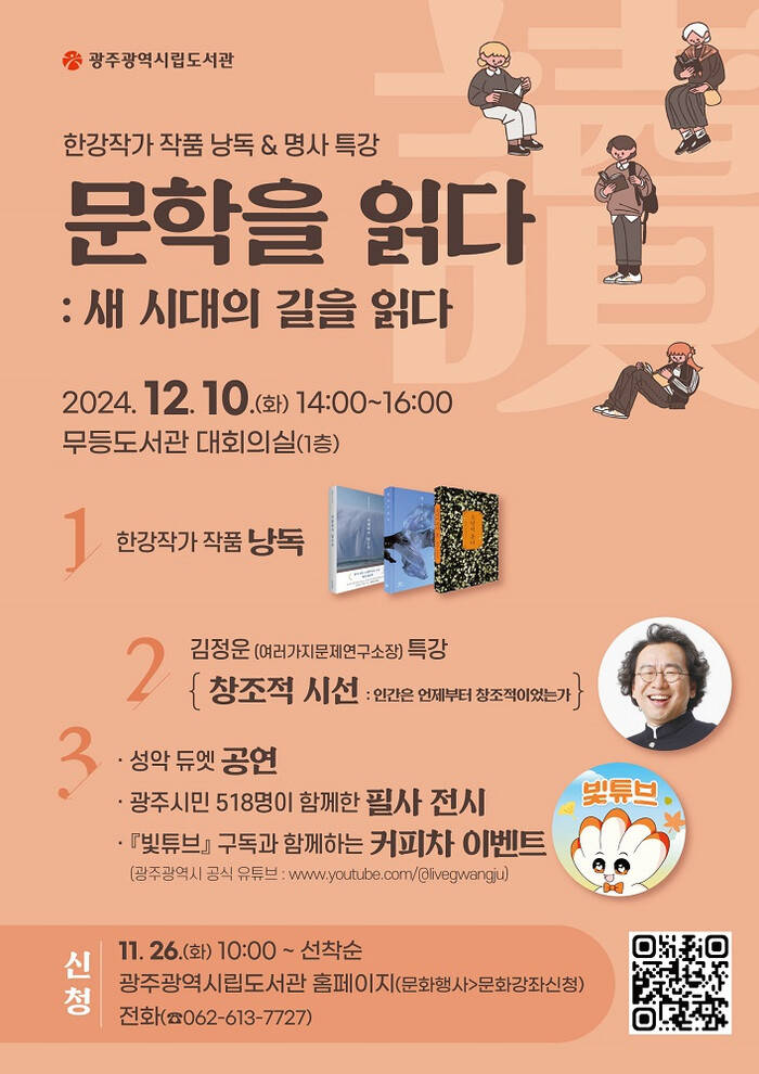 광주시립도서관은 노벨문학상 시상식 당일인 12월10일 오후 2시부터 무등도서관 대회의실에서 낭독회를 연다. 독서동아리 회원, 필사 참여자, 빛고을 책읽는 시민 등 총 5명이 낭독자로 참여해 한강 작가의 작품을 함께 느끼고 생각하는 시간을 갖는다.