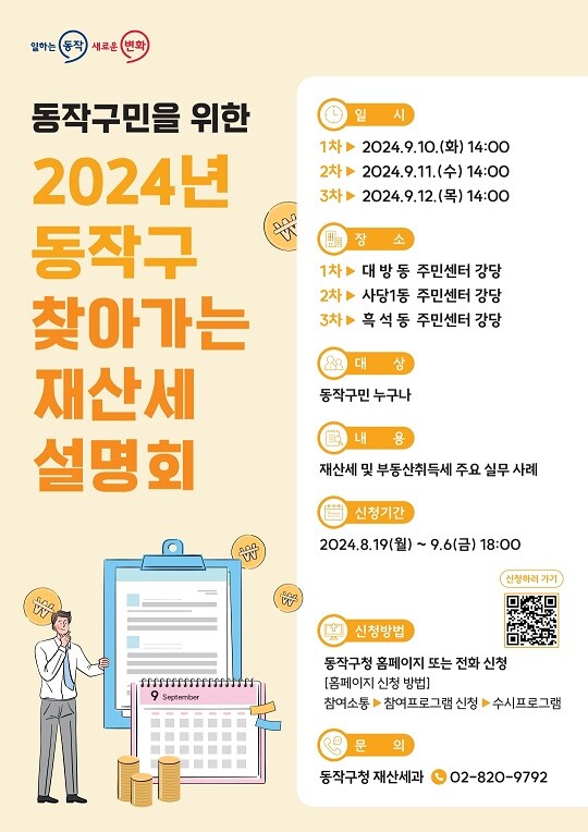 대방동(10일), 사당1동(11일), 흑석동(12일) 주민센터 강당에서 오후 2시부터 한 시간 동안 진행되며, 구 재산세과 소속 직원들이 직접 강연자로 나선다.