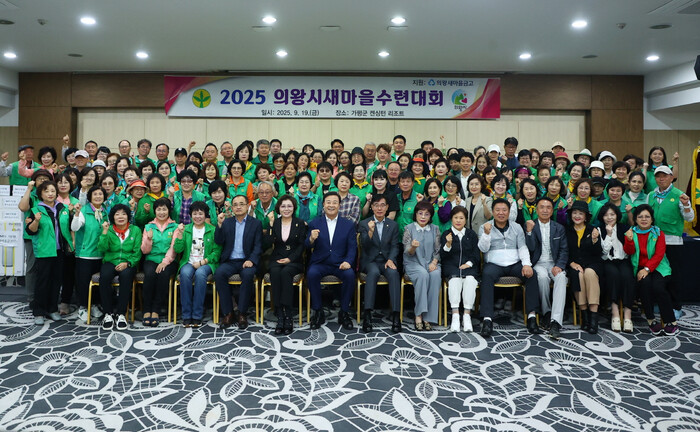 | ▲ 김성제 의왕시장(앞줄 왼쪽 여섯번째)이의왕시 새마을회가 지난 19일 가평 켄싱턴리조트에서 ‘2025년 의왕시 새마을회 수련대회’에 참석자들과 기념 촬영을 하고 있다 /사진제공=의왕시 |