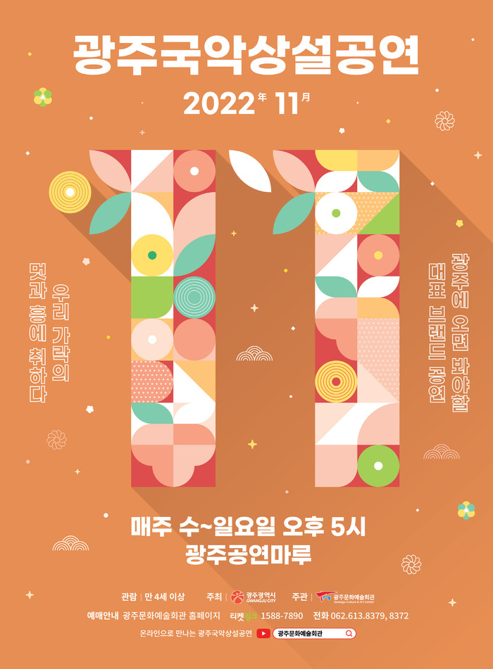 광주국악상설공연은 매주 수~일요일 오후 5시 광주공연마루에서 시립예술단과 민간예술단체가 참여해 전통국악, 창작국악, 국악마술극, 미디어아트와 만난 국악 등 국악의 모든 즐거움을 한 곳에서 남녀노소 누구나 만나볼 수 있는 광주 대표 브랜드 공연이다.