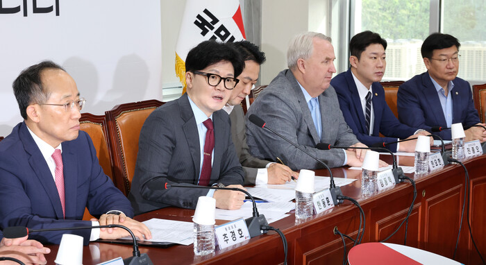 한 대표는 이날 취임 후 국회에서 열린 첫 최고위원회의에서 민주당이 윤석열 대통령이 재의요구권(거부권)을 행사한 채상병특검법 재의결 안건 상정을 예고한 것에 대해 “잘못된 법이 통과돼 국민이 피해 보는 걸 단호히 막겠다”고 밝혔다.