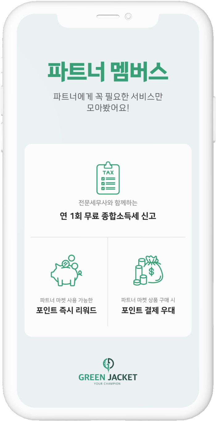 그린재킷 파트너 앱에서는 종합소득세 모의 계산기를 통해 내 소득을 입력해 예상 종합소득세를 미리 확인할 수 있다. 또 세금 종류와 합법적 절세방안 그리고 향후 국민연금과 건강보험에 대한 고민까지 Q&A를 통해 전문세무사와 1:1로 상담할 수 있다.