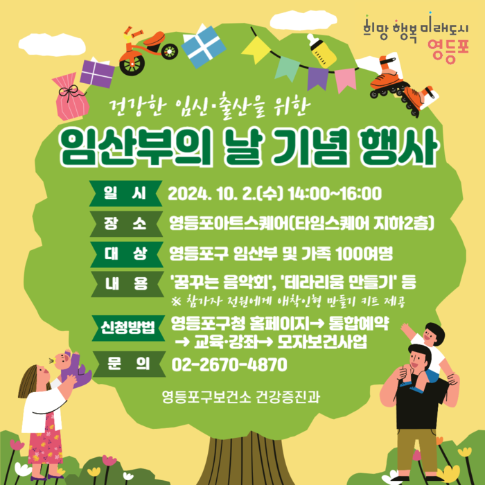 구는 19회를 맞이한 ‘임산부의 날’을 기념해 10월2일 오후 2시부터 영등포 아트스퀘어에서 기념 행사를 진행한다. 이번 행사에서는 ▲플루트 4중주 ‘꿈꾸는 음악회’ ▲원예 태교 프로그램 ‘테라리움 만들기’ ▲‘애착인형 바느질 손태교 키트’ 배부 등 다채로운 프로그램이 진행된다.