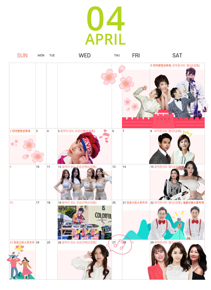 4월 주요 공연은 수요 버스킹 ‘음악이 있는 오감(五感)산책’과 토요 콘서트 ‘뮤직 콘서트 봄’으로 매주 수요일과 토요일 강진 오감통 일원에서 흥겨운 무대를 선사한다.