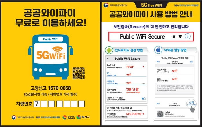이번 마을버스 공공 와이파이 서비스 제공으로 현재 운행중인 시내버스(220대)와 같이 마을버스에서도 공공 와이파이 서비스를 무료로 이용할 수 있게 된다. 마을버스 공공 와이파이를 사용하려면 버스 탑승 후 스마트폰 와이파이 설정에서 일반형인 ‘Public Wifi Free’또는 보안접속형인 ‘Public Wifi Secure’에 선택하여 이용할 수 있다.