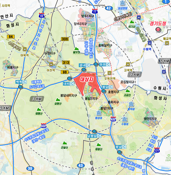 봉담3지구는 화성시 봉담읍(상리·수영리·내리) 및 매송면(천천리·원평리) 일원에 조성되며, 면적은 2,28만9,715㎡다.