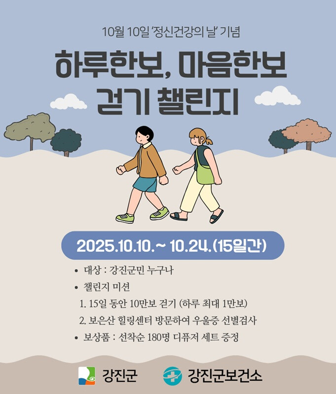 한준호 보건소장은 “걷기는 몸과 마음의 건강을 동시에 지키는 가장 손쉬운 방법으로 이번 걷기 챌린지를 통해 군민들이 정신건강의 중요성을 다시 한번 되새기고, 건강한 생활 습관을 실천하는 계기가 되길 바란다”며 “앞으로도 정신건강 증진을 위한 다양한 프로그램을 지속적으로 운영해 나가겠다”고 말했다.