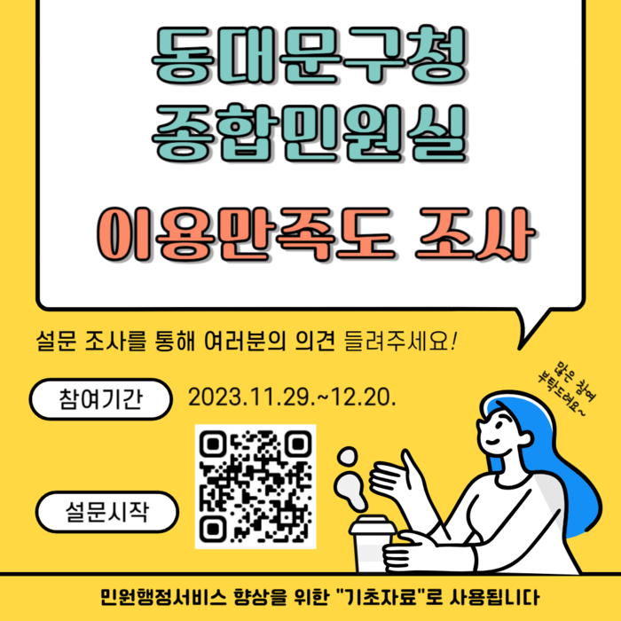 이필형 구청장은 “이번 조사는 동대문구 민원서비스에 대한 이용자 만족도를 확인하고, 민원서비스가 어떤 방향으로 나아가야 할지에 대한 다양한 의견을 수렴할 수 있는 좋은 기회이다.”며, “더 좋은 민원서비스를 발굴·제공하기 위한 설문조사니 구청을 방문하는 구민 여러분들의 많은 참여 부탁드린다”고 전했다.