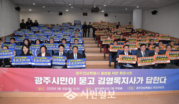 [광주=정찬남 기자] 강기정 광주광역시장(앞줄 왼 쪽부터 다섯 번째)이 19일 시청 무등홀에서 열린 '(가칭)광주전남특별시 출범을 위한 톡 콘서트'에 참석해 참석자들과 함께 퍼포먼스를 하고 있다. /광주광역시 제공