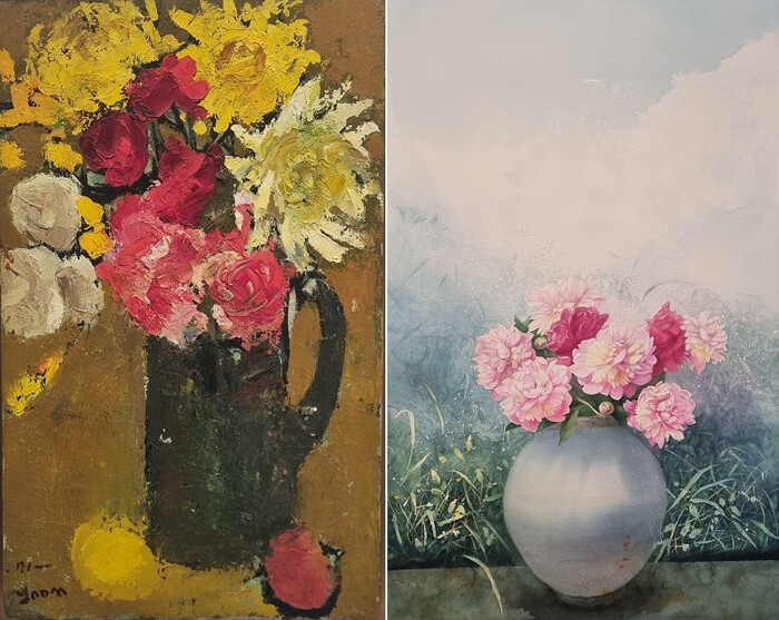 | ▲ 왼 쪽부터 윤재우 작가 국화 유화, 김숙연 작가의 ’서정‘. 수채화. / 강진군 제공 |