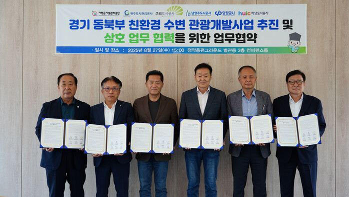 [남양주=최광대 기자] 남양주도시공사(이하 공사, 사장 이계문)는 ‘경기 동북부 친환경 수변 관광개발 사업 추진 및 상호 업무 협력’을 위해 27일(수) △가평군시설관리공단(이사장 최승수) △광주도시관리공사(사장 최찬용) △구리도시공사(사장 유동혁) △양평공사(사장 신범수) △하남도시공사(사장 최철규)와 6자 간 업무협약을 체결했다고 밝혔다.