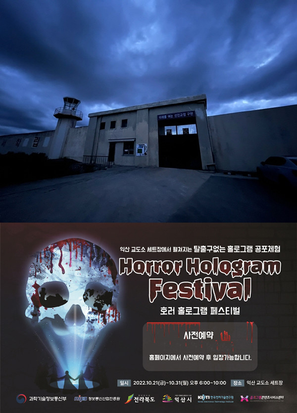 ‘호러 홀로그램 페스티벌’은 홀로그램을 활용한 공포 실감 콘텐츠와 방문객이 직접 참여하는 오감 콘텐츠를 접목, 유일무이한 교도소 공포체험으로 풍부하고 몰입도 높은 콘텐츠들을 통해 오싹하고 생생한 공포를 느낄 수 있을 것으로 기대를 모으고 있다. 행사는 오는 10월 21일부터 10월 31일까지 11일 간 오후6시부터 밤 10시까지 익산교도소세트장에서 진행한다.