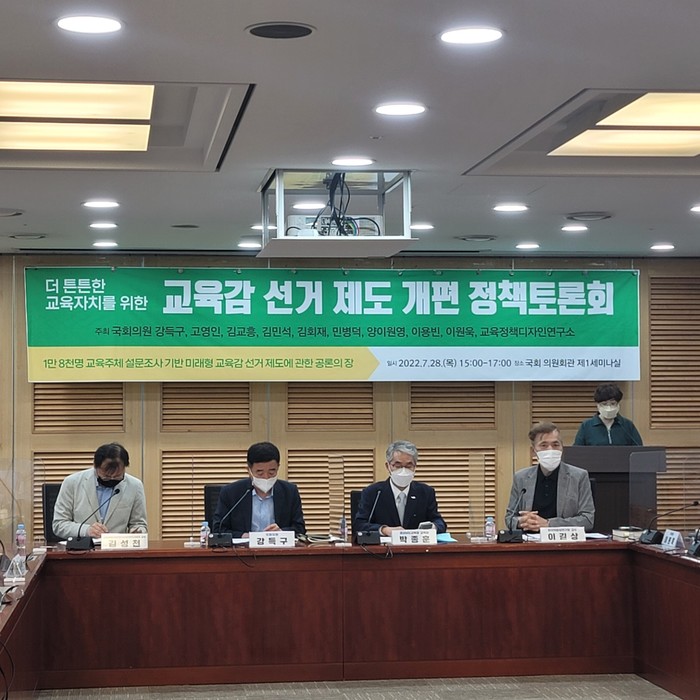 이날 토론회는 강득구 국회 의원 실과 교육 정책 디자인 연구소 주최로 열렸으며, 교육감 선거 제도 개편과 관련하여 1만 8천 명의 학생, 학부모, 교원, 교육 전문 직원 등 교육 주체의 설문조사 결과를 바탕으로 토론이 이루어졌다.