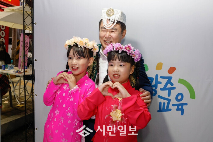 | ▲ 이정선 광주광역시교육감이 지난 18일 광산구 월곡동 목련로 일원에서 광주 광산구 주최로 열린 ‘광산세계야시장’의 광주광역시서부교육지원청 운영부스인 ‘글로벌 야(夜)체(야시장 체험) 한마당’ 부스에서 전통의상을 입은 학생들과 기념촬영을 하고 있다. / 광주광역시교육청 제공 |