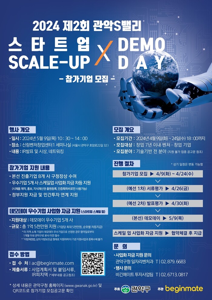 ‘관악S밸리 제2회 스타트업 스케일업 X 데모데이’는 오는 5월9일 개최예정이며, 참가 대상은 정보통신, 바이오, 헬스케어 등 첨단 기술 기반 분야 7년 이내 벤처 창업기업이다. 예선 심사(1차 서류심사, 2차 발표심사)를 거쳐 최종 8개 기업이 본선 무대에 오른다.