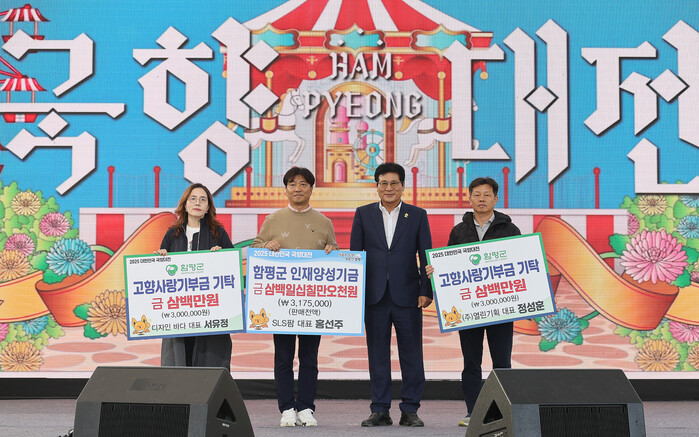 또 SLS팜(대표 홍선주)이 함평군 인재양성기금에 317만 1천 원을, 디자인바다(대표 서유정)와 ㈜열린기획(대표 정성훈)이 고향사랑기부금 300만 원을 각각 기탁하며 축제의 의미를 더했다.