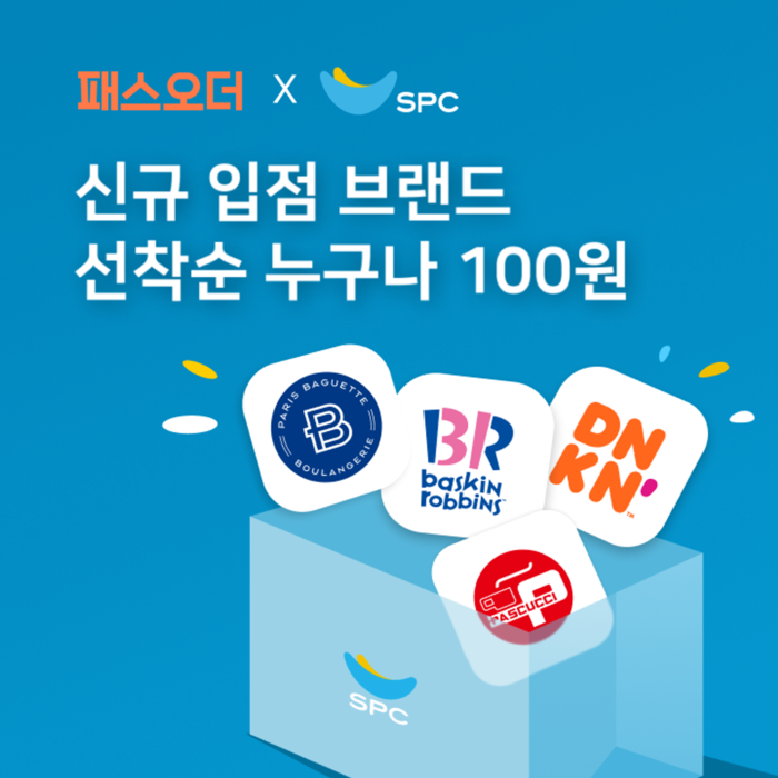 2023년 12월 11일(월)부터 17일(일)까지 제휴 기념으로 패스오더 앱에서 배스킨라빈스 블록팩, 던킨 스모어필드, 파스쿠찌 아메리카노를 100원에 구매할 수 있다. 1월에는 파리바게뜨도 100원 이벤트를 진행할 예정이다.