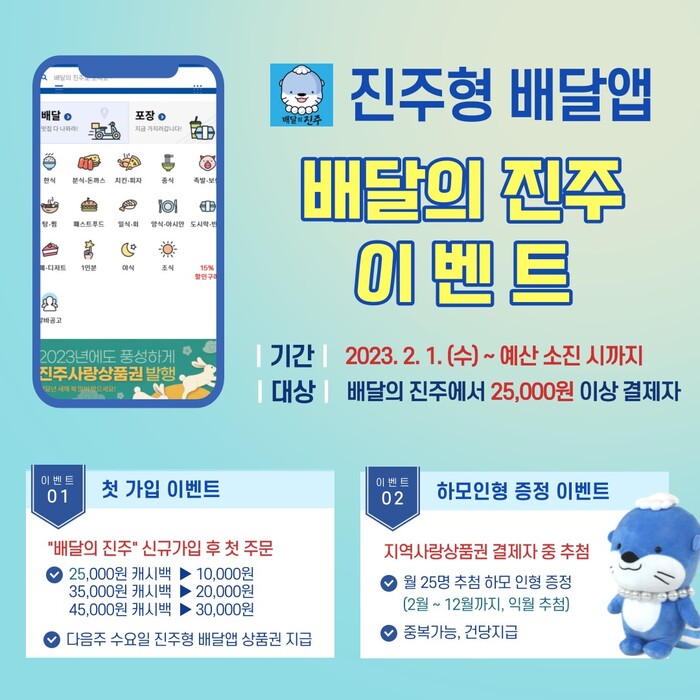 봄맞이 이벤트는 신규가입자가 아니더라도 지역사랑상품권으로 2만 5000원 이상 주문 결제하면 진주형 배달앱 상품권 5000원 캐시백을 지급 받는다. 또한 매달 25명을 추첨하여 다음 달에 2만 2000원 상당의 ‘하모인형’을 증정하는 이벤트에도 자동 응모된다.
