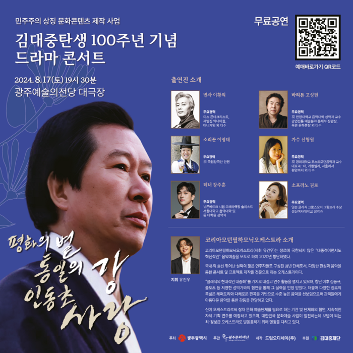 [광주=정찬남 기자] 광주광역시(시장 강기정)는 고 김대중 대통령의 탄생 100주년과 서거 15주기를 기념하는 특별음악회를 오는 17일 오후 5시 전남대학교 민주마루 대강당에서 개최한다.