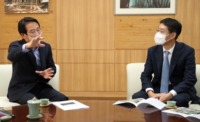 | ▲ 강진원 강진군수(왼 쪽)가 지난 1일 군수실에서 김우태 백제약품 사장과 면담에서 초당림 개방 및 협력사업 등 초당림 관광 명소화 구축을 위한 사업계획을 설명 하고 있다. / 사진=강진군 제공 |