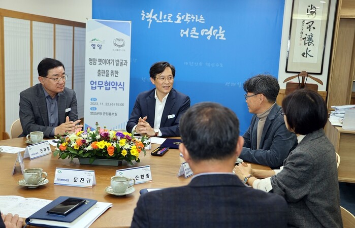| ▲ 우승희 영암군수(가운데)가 지난 22일 군청에서 책마을해리의 도서출판 기역 관계자와 ‘영암 옛이야기 발굴 및 출판 업무협약' 에 대한 논의를 하고 있다. / 영암군 제공 |