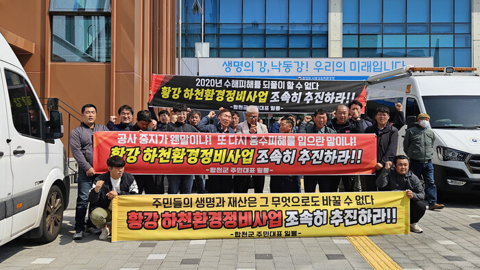 합천군 주민들은 청장 면담 후 낙동강유역환경청 앞에서 “합천군민들은 2020년도 수해피해 악몽을 되풀이하고 싶지 않다”고 호소하며 “황강 하천환경정비사업의 조속한 시행을 강력히 촉구”하였다. 아울러 “환경단체로 인해 공사가 중단된다면 수해 피해 발생 시 합천군민은 환경단체에 피해 보상을 청구 할 것”이라며 이를 강력히 규탄했다.