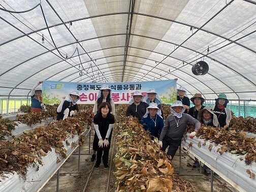 이날 농식품유통과 직원 13명은 청주시 가덕면 삼항리 소재 과수농가를 찾아 ‘딸기순 정리 작업’을 하며 일손을 보탰다.