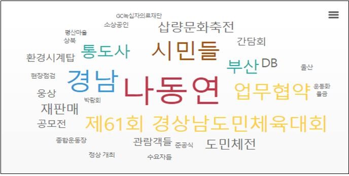 분석 결과 2022년 상반기 대비 민선8기 100일간 긍정단어 13% 증가하였으며 낙동강유역 상생협력, 도민체전, 통도사 미디어아트, 반다비 체육관 등 긍정 키워드인 기대, 노력으로 평가됐다. 또 철거, 혐의, 강제 등 부정 키워드는 평산마을 집회 관련으로 확인됐다.