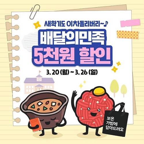 행사기간은 3월 20일(월)부터 3월26일(일)까지 7일간 진행하며, 할인 방법은 배달의민족 브랜드관이나 상단 배너에 연결된 페이지에서 할인 쿠폰을 다운로드한 후 결제 시 적용하면 5천 원 자동 할인된 금액으로 주문된다. 쿠폰은 이벤트 기간 내 무제한 다운로드 가능해 혜택의 폭이 넓다. 최소 주문금액은 17,000원이며 자세한 사항은 배달의민족 앱 내에 이차돌 브랜드관을 참조하면 된다.