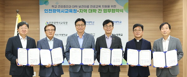 [인천=김형만 기자] 인천시교육청은 8월 12일 인천 5개 대학과 학교 건강증진 및 보건·의료 전공 교육 지원을 위한 업무협약을 체결하고 인천 특화 전문 의료적 건강 관리 협력 모델 구축에 나섰다고 밝혔다.