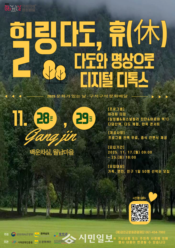김기태 (재)강진군문화관광재단 대표이사는 “다산 정약용이 사랑한 강진의 차 문화처럼, 이번 프로그램이 참가자들에게 마음을 고요히 하고 에너지를 회복하는 시간이 되길 바란다”며 “강진의 자연과 전통을 함께 경험할 수 있는 특별한 힐링 프로그램이 될 것”이라고 말했다.