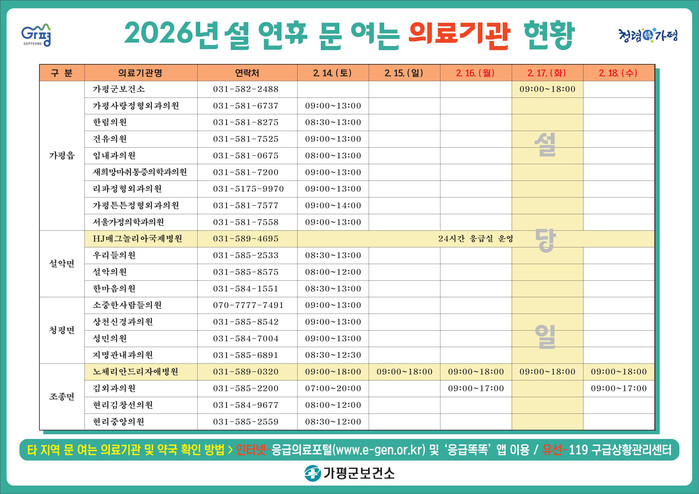 아울러 가평군은 설 연휴 동안 운영하는 의료기관, 약국 정보를 사전에 안내하고 있다. 연휴 기간 문을 여는 의료기관 및 약국 정보는 △가평군청 및 가평군보건소 홈페이지 △119구급상황관리센터 △응급의료포털 △보건복지콜센터(129)에서 확인할 수 있다.
