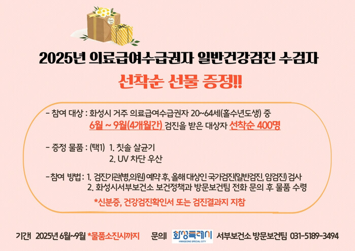 참여를 원하는 대상자는 기간 내 검진기관(병·의원)에 예약 후 검진을 받은 뒤, 화성시서부보건소 보건정책과 방문보건팀에 전화로 문의하면 선물을 받을 수 있다.