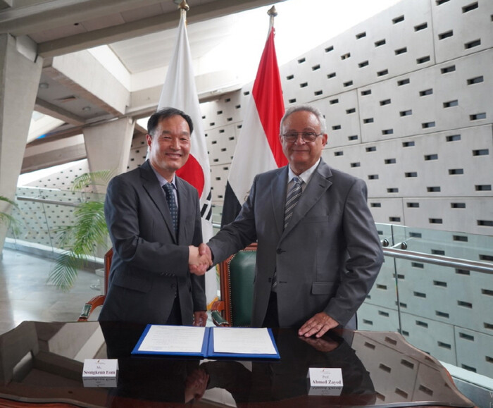 | 국립세계문자박물관 엄성근 사무총장(관장 대행 왼쪽)과 알렉산드리아도서관장 아흐메드 자예드 박사가 포즈를 취하고 있다. |