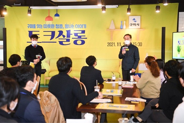 | ▲ 구미를 잇는 따뜻한 청춘, 힘나는 이야기 '토크살롱' 에 참석한 장세용 시장이 인사말을 전하고 있다. (사진제공=구미시청) |