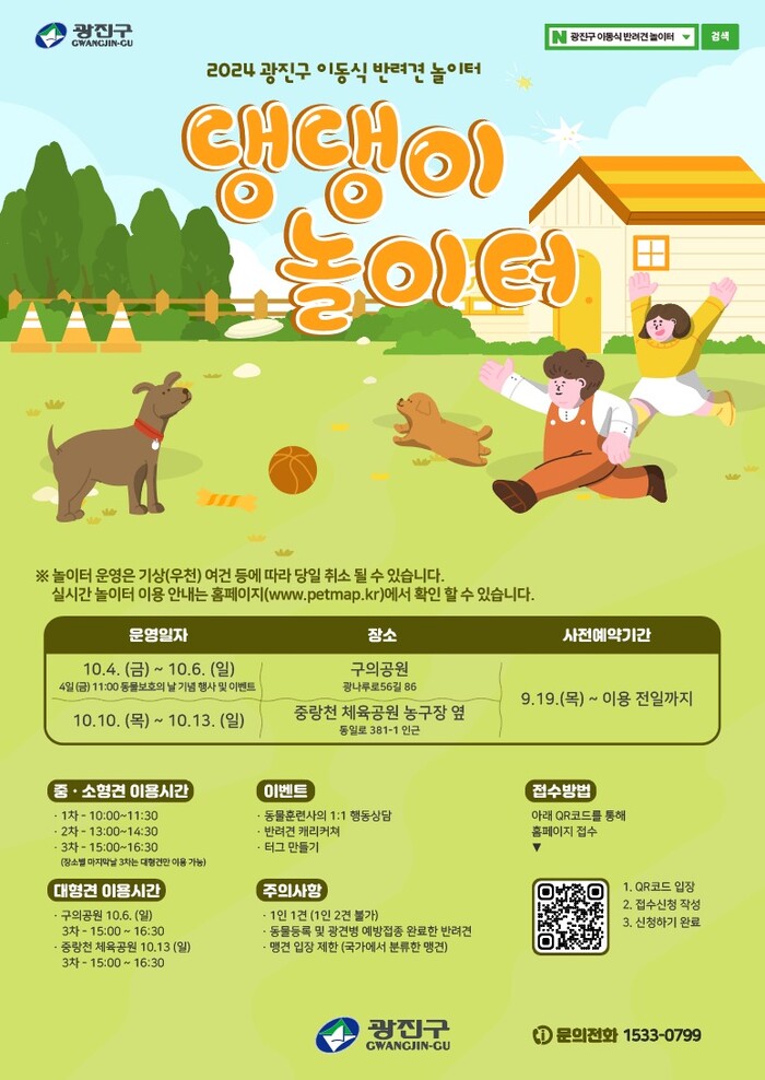 [시민일보 = 여영준 기자] 서울 광진구(구청장 김경호)가 오는 10월4~13일 이동식 반려견 놀이터인 ‘댕댕이 놀이터’를 운영한다.