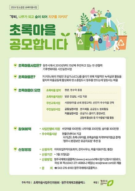 시 관계자는 “청주의 모든 마을이 초록마을이 되도록 초록마을사업 공모에 청주시민들의 많은 관심과 참여를 바란다”고 말했다