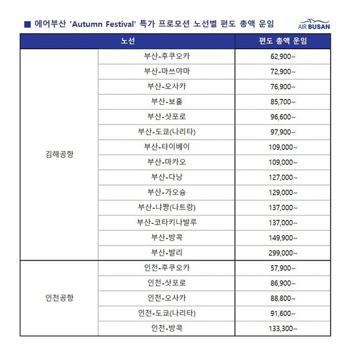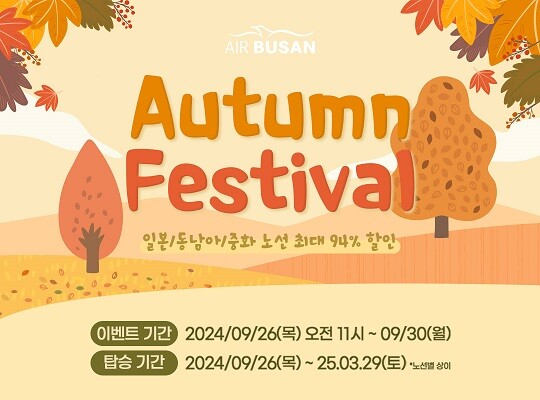에어부산 관계자는 “다가오는 가을·겨울에도 단풍과 온천을 즐길 수 있는 일본은 물론 여름 휴가철을 피해 동남아로 떠나는 여행객까지 꾸준히 수요가 이어질 것으로 예상한다”면서, “10월에는 최대 9일의 징검다리 연휴가 이어지고, 취항을 앞두고 있는 발리 노선도 프로모션에 포함되는 만큼 이번 프로모션을 통해 알차고 합리적인 여행을 계획하시기 바란다.”라고 전했다.