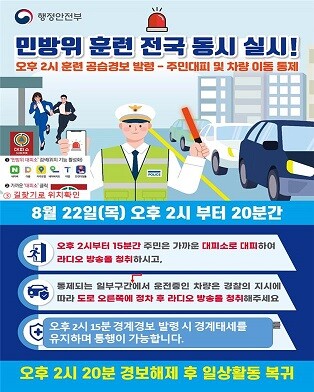 훈련 공습경보가 발령되면 훈련 구간의 교통신호등이 적색 점멸신호로 운영된다. 22일 오후 2시부터 2시5분까지 5분간 통제구간을 운행 중인 차량은 도로 오른쪽으로 정차한 뒤 차에서 라디오를 들으면서 안내방송에 따라 행동해야 한다.