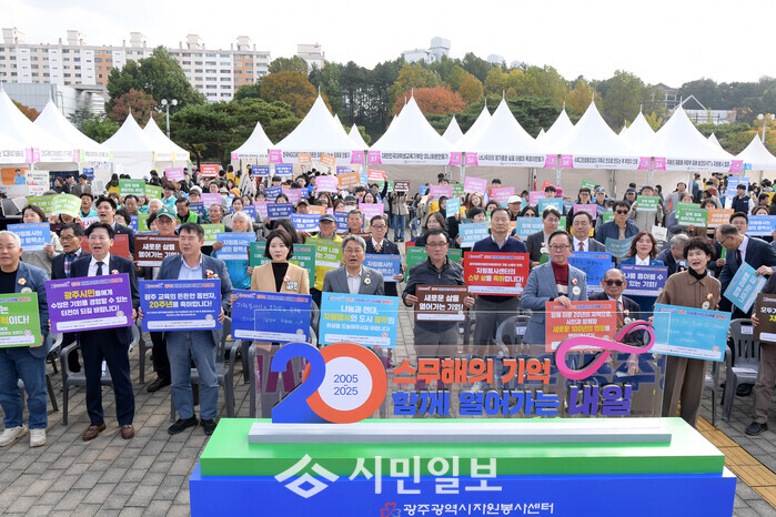 | ▲ 강기정 광주광역시장((앞줄 왼 쪽부터 다섯 번째)이 1일 오후 광주역사민속박물관 야외광장에서 열린 2025 광주광역시 자원봉사박람회에 참석하여 축사를 한 후 참석자들과 함께 희망메시지 퍼포먼스를 하고 있다. /광주광역시 제공 |