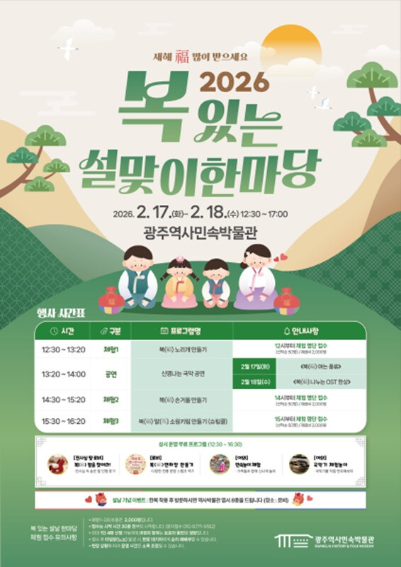 이부호 광주역사민속박물관장은 “설맞이 한마당은 명절 문화를 현재의 삶 속에서 되살리고, 시민이 그 주체가 되도록 기획한 행사”라며 “박물관이 과거를 보존하는 공간을 넘어 시민과 함께 문화를 만들어가는 열린 문화공간이 되도록 노력하겠다”고 말했다.