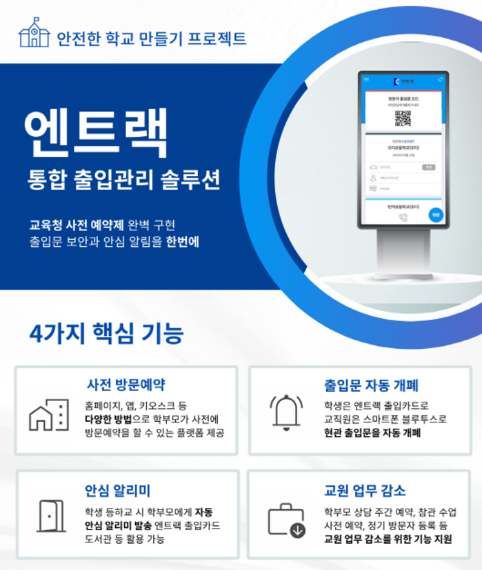 교육부의 요구에 맞추어 개발된 엔트랙은 특히 외부인의 무단 출입을 방지하여 학습 환경을 안전하게 유지할 수 있도록 설계됐다는 게 회사측의 설명이다.