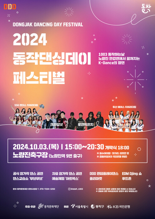 축제는 오후 3시 동작구 어린이·청소년 태권도 시범단의 축하 공연을 시작으로 지난 8월 참가작 공모를 통해 선정된 ‘자유참가 댄스팀 공연’과 ‘랜덤 플레이 댄스’ 무대가 연달아 펼쳐지고, ‘로맨틱펀치’의 초청공연도 이어진다.