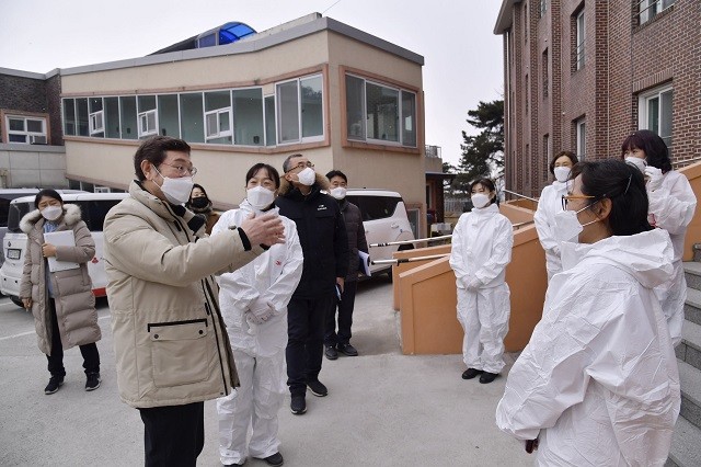[광주=정찬남 기자] 이용섭 광주광역시장은 설 명절을 맞아 지난 1일 오후 서구 노인복지시설인 벧엘요양원을 방문해 코로나19 방역상황을 점검하고 요양보호사들을 격려했다./광주광역시 제공