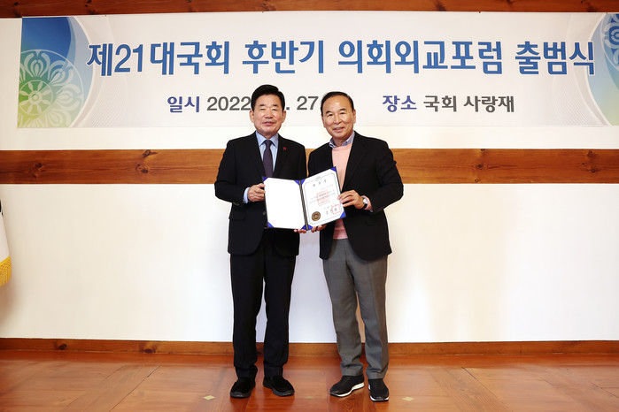 김진표 국회의장은 27일(화) 국회 사랑재에서 의회외교포럼 출범식을 열고, 정부가 미처 다루지 못한 부분에서 의회 차원의 외교 활동을 선도적으로 이끌 의회외교포럼에 박덕흠 의원(한-중앙아시아)을 비롯해 국민의힘 주호영(한-미), 조경태(한-일), 김영선(한-중), 더불어민주당에 변재일(한-미), 윤호중(한-일), 홍영표(한-중) 의원 등을 위촉했다.