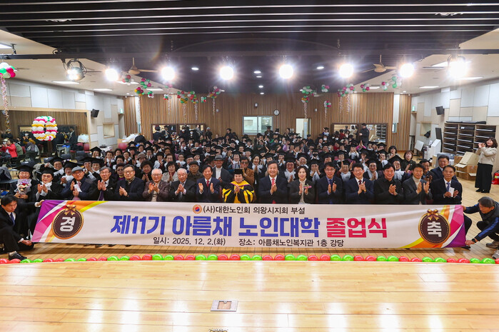 | ▲ 2025학년도 제11기 아름채 노인대학 졸업식 참석자들이 기념 촬영을 하고 있다 /사진제공=의왕시 |
