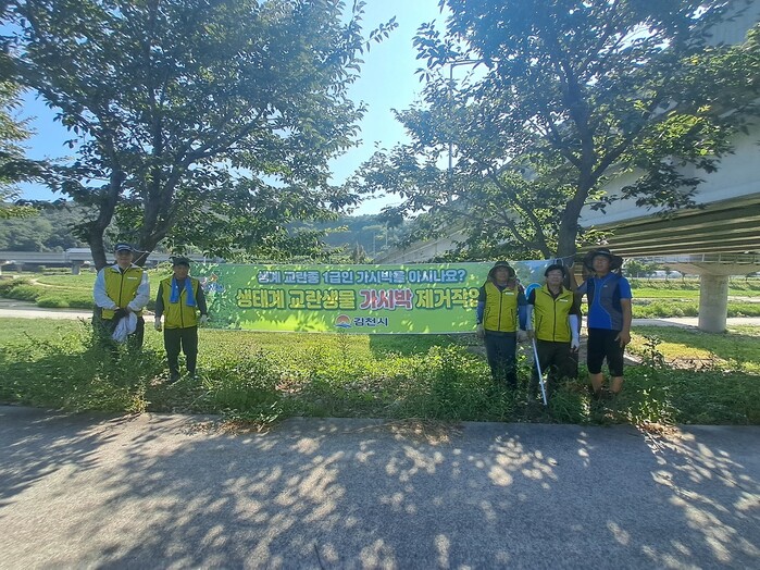 김천시는 매년 이러한 생태계 교란 식물의 확산을 방지하고자 퇴치 사업을 해오고 있다. 올해 작업 구간은 남면 초곡리 일원과 농소면 입석리부터 연명리까지의 구간으로, 7월부터 전담 인력 약 10여 명을 투입해 교란 식물 퇴치에 힘쓰고 있다.