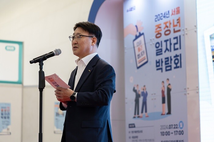 | ▲ 22일 동대문디자인플라자(DDP) 아트홀1관 2024년 서울 중장년 일자리박람회 개막식, 전찬호 코레일네트웍스 대표이사가 중장년 일자리 창출 및 채용문화 확산 사례를 발표하고 있다. |