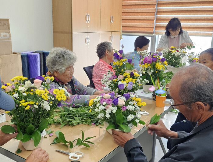▲ 화성특례시 팔탄보건지소 재능기부 프로그램으로 어르신들이 꽂꽂이 활동에 참여하고 있다 /사진제공=화성특례시 |
